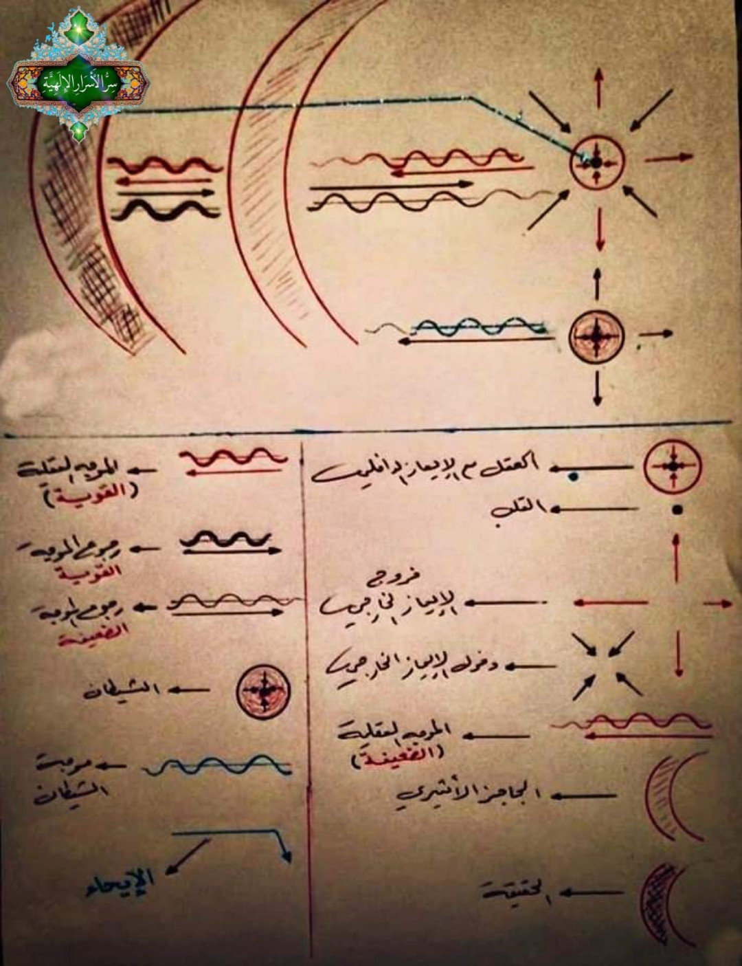 ففي المخطط أدناه ... ( مخطط الإيحاء ) ... تجد بإن ( الإيحاء ) وهو الخط الذبذبي الراجع من ( الحقيقة ) إلى ( القلب ) وهو باطن العقل المعنوي ...